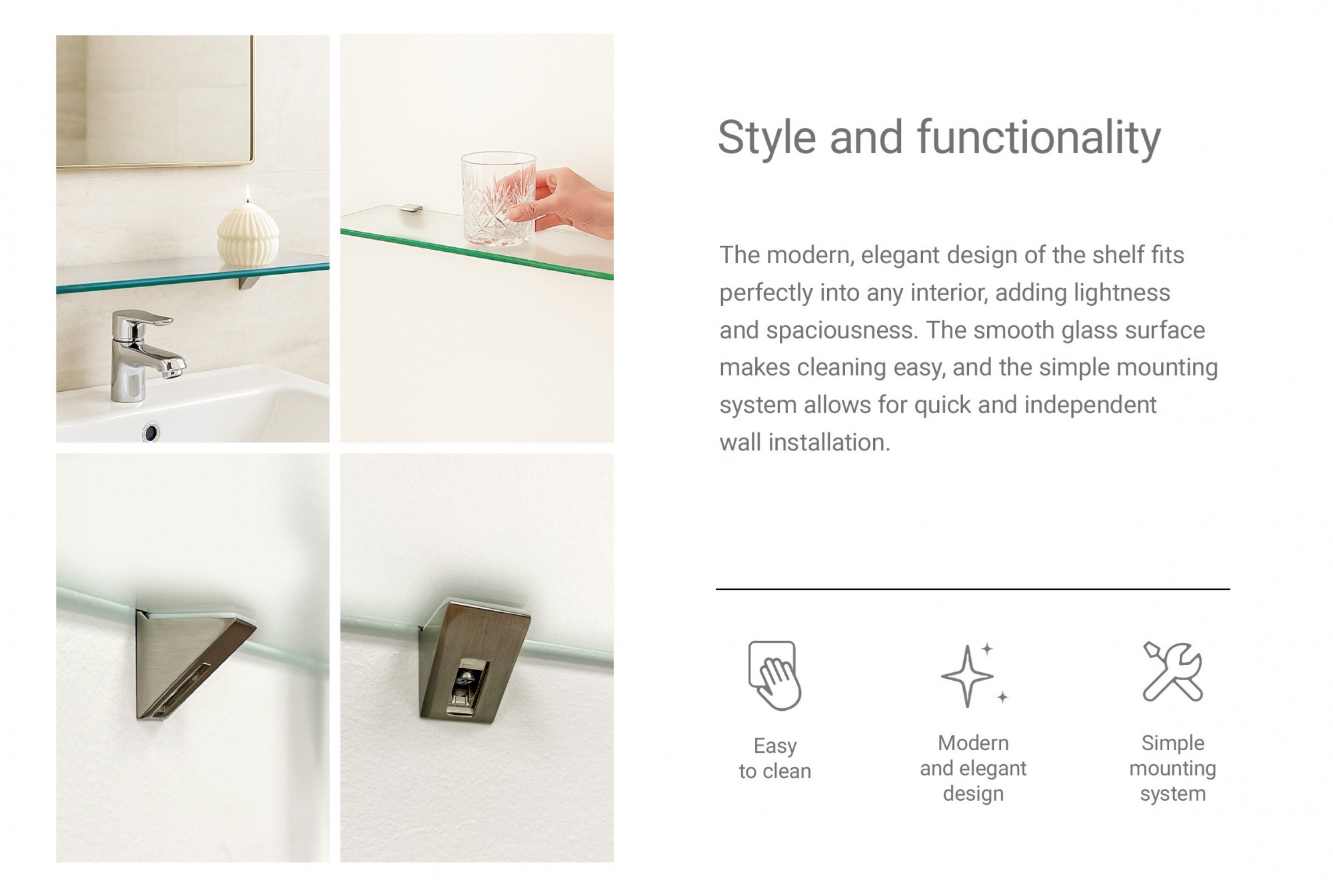 - Easy installation: Intuitive assembly method minimizes fitting time and helps achieve a clean, level installation beneath a mirror or on a tile wall.